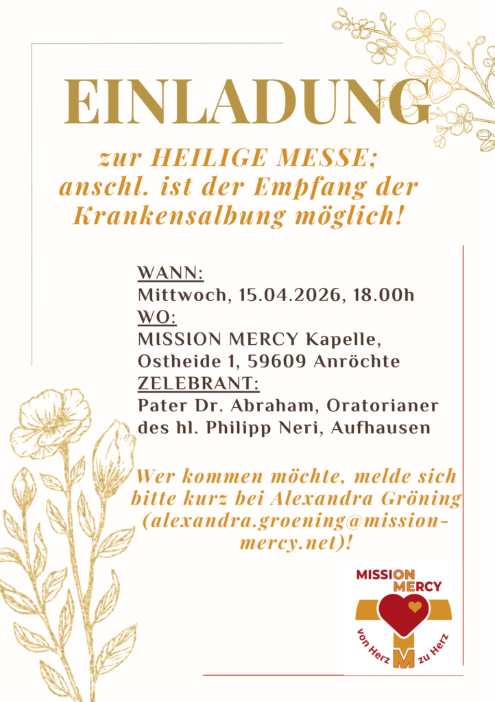 Am Mittwoch, 15.04.2026, wird in der MISSION MERCY Kapelle um 18.00h eine Heilige Messe sein – anschl. besteht die Möglichkeit der Krankensalbung! Wer kommen möchte, melde sich bitte kurz bei Alexandra Gröning (alexandra.groening@mission-mercy.net)!