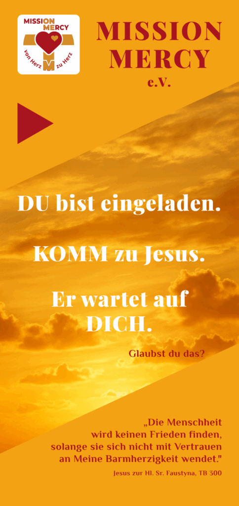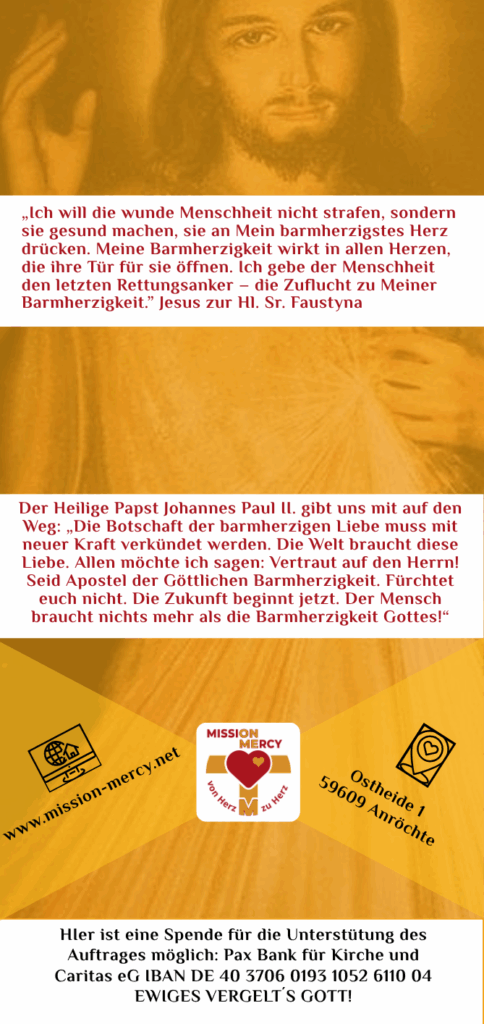 Der Auftrag vom MISSION MERCY e.V. ist die Verbreitung des Geheimnisses der Barmherzigkeit Gottes (= Apostolat).