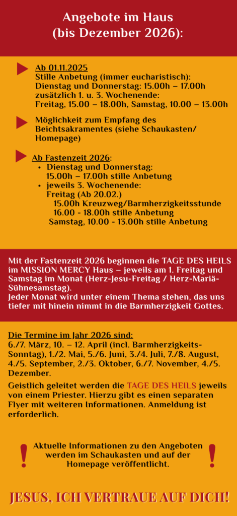 Das Haus der Göttlichen Barmherzigkeit - MISSION MERCY Haus (MMH) - dient der Verortung des Vereins ("Vereinssitz"), als ein marianisches, eucharistisches Haus!