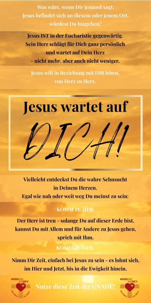 Herzliche Einladung zu den Anbetungszeiten in die Josef-Kapelle im MISSION MERCY Haus zu kommen (s. Flyer) – der Herr wartet TREU!