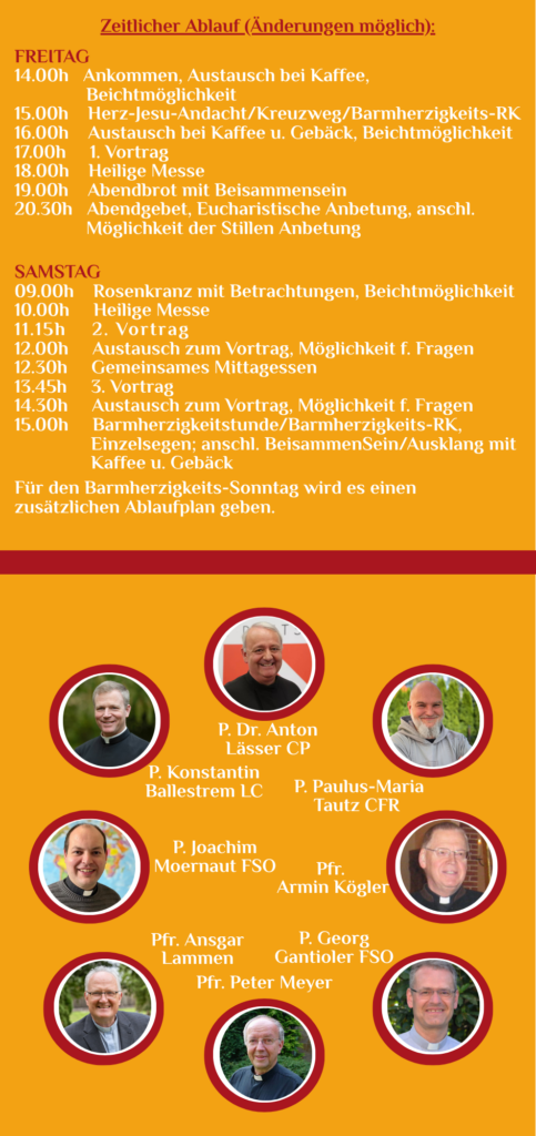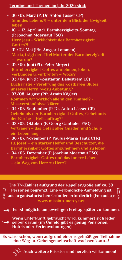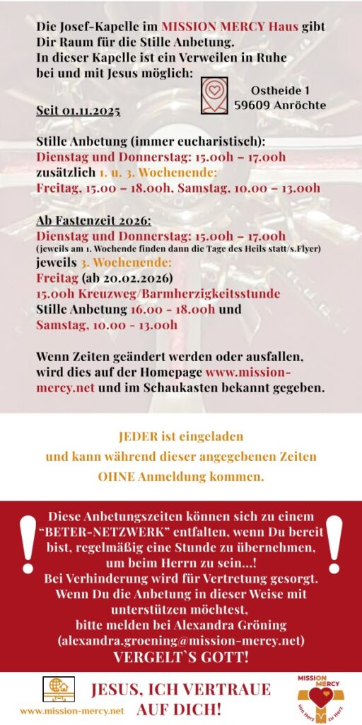 In der Zeit vom 24.12.2025 – 11.01.2026 wird im MISSION MERCY Haus KEINE Anbetungszeit in der Josef-Kapelle sein – dann wieder ab Dienstag, 13.01.2026 (s. Flyer)!!!